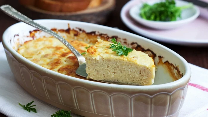 - Peci v pečici, segreti na 180 stopinj Celzija, 30 minut, dokler ne dobi zlate barve. Sufle odstranite iz pekača in ga narežite na kose.